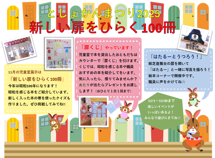 新しい扉を開く100冊 11月はとしょかんまつりを開催します! そして今年は昭和100年です。 今月の児童室では、昭和を感じる本を中心に 100冊あまりをご紹介します。 新しく入った本の帯を使ったクイズも作りました。 今までしらなかった扉を開くかもしれませんよ! ぜひ挑戦してみてくださいね☆ 【展示期間】11月1日(土)〜 11月30日(日)